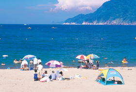 約400mにわたる海水浴場で、広々とした若狭湾の眺めは最高です。シャワー、トイレ、浜茶屋などが整備されていて、美しい海をゆったりと満喫できます。